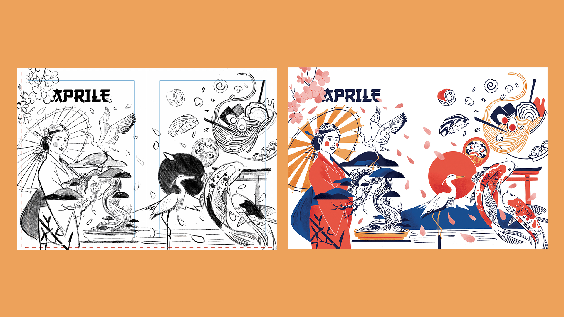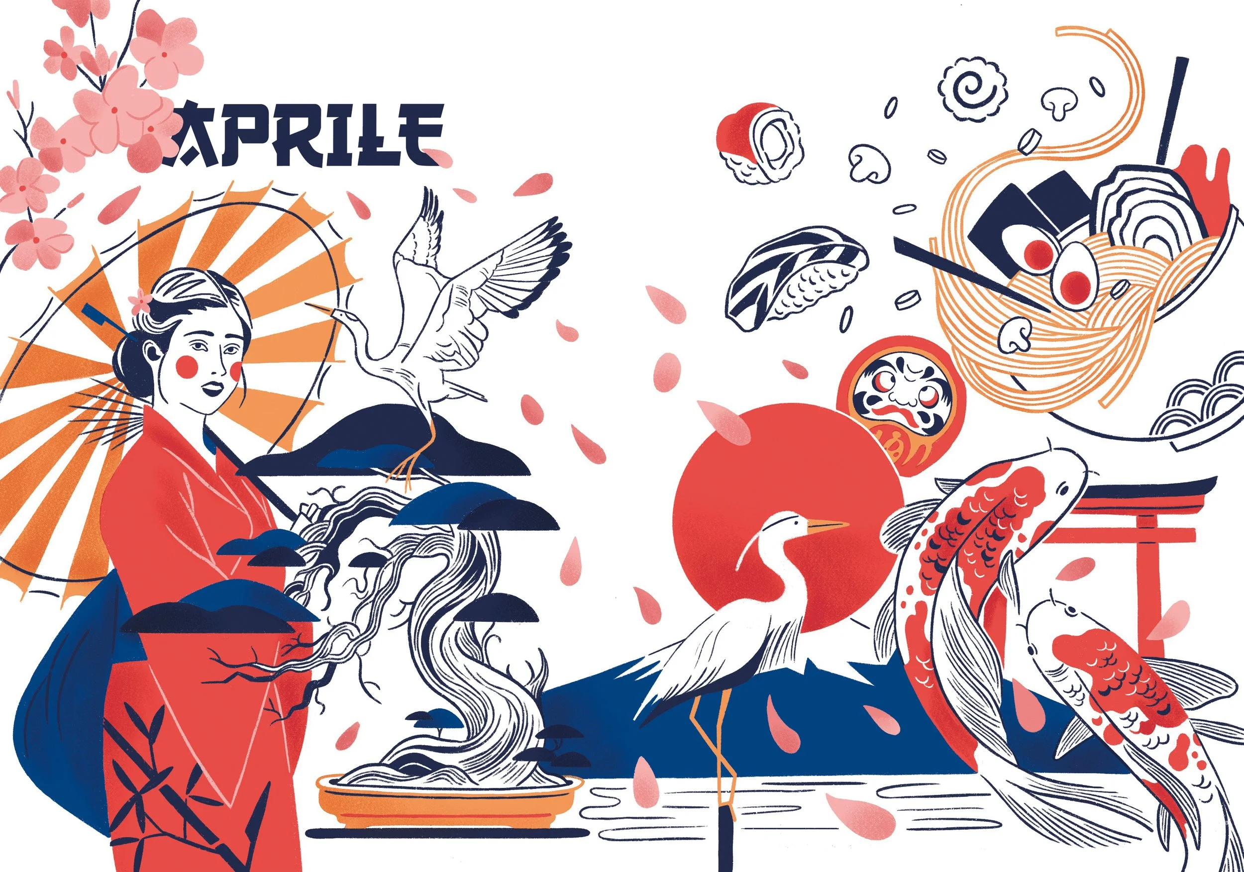 Un’illustrazione dall’atmosfera invernale, tra fiocchi di neve, luci soffuse e la magia del Natale nordico.Aprile – Giappone