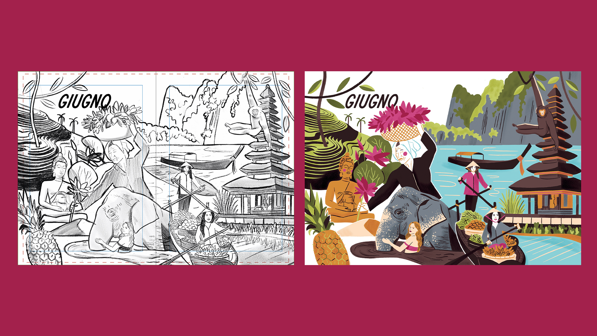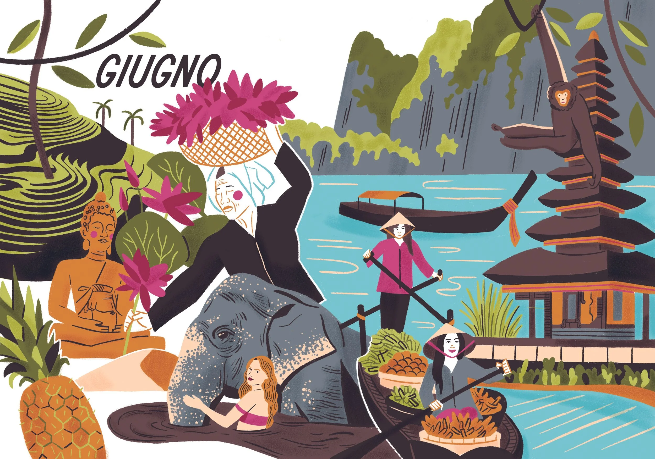 Un viaggio illustrato tra risaie verdi, frutti tropicali e paesaggi esotici dal forte impatto visivo.
